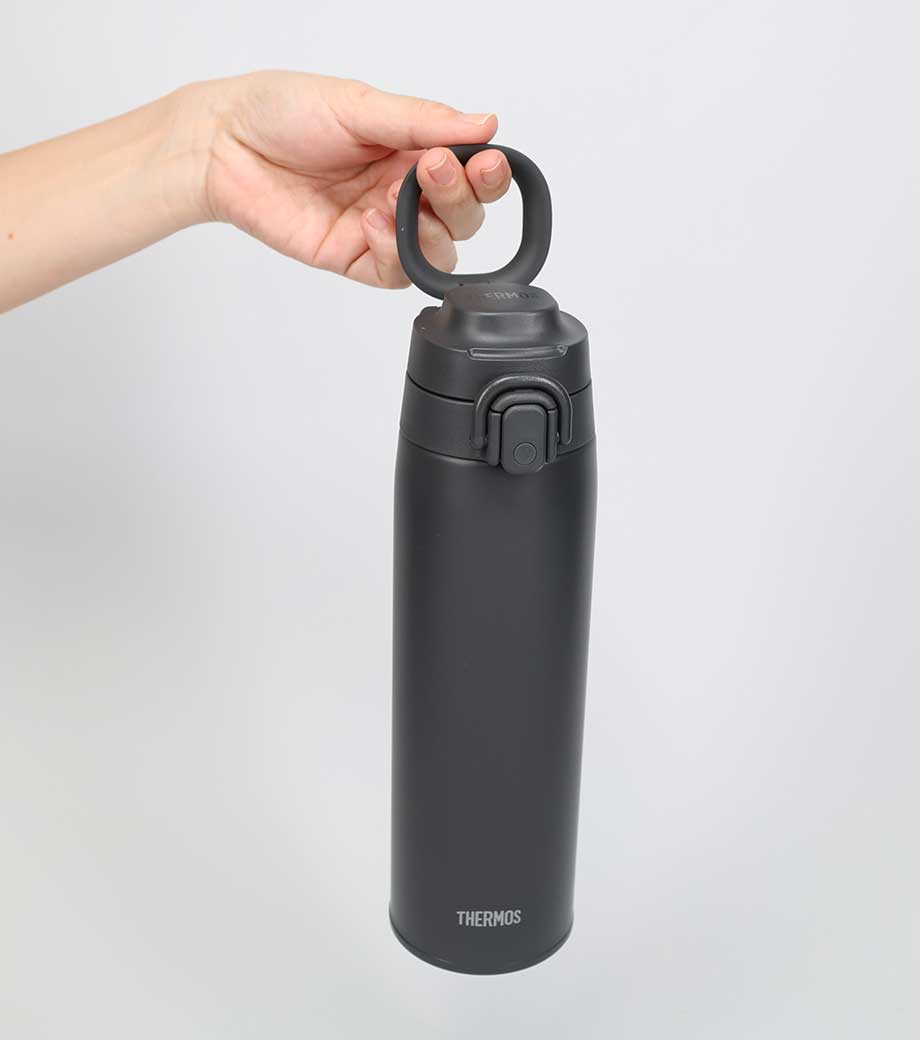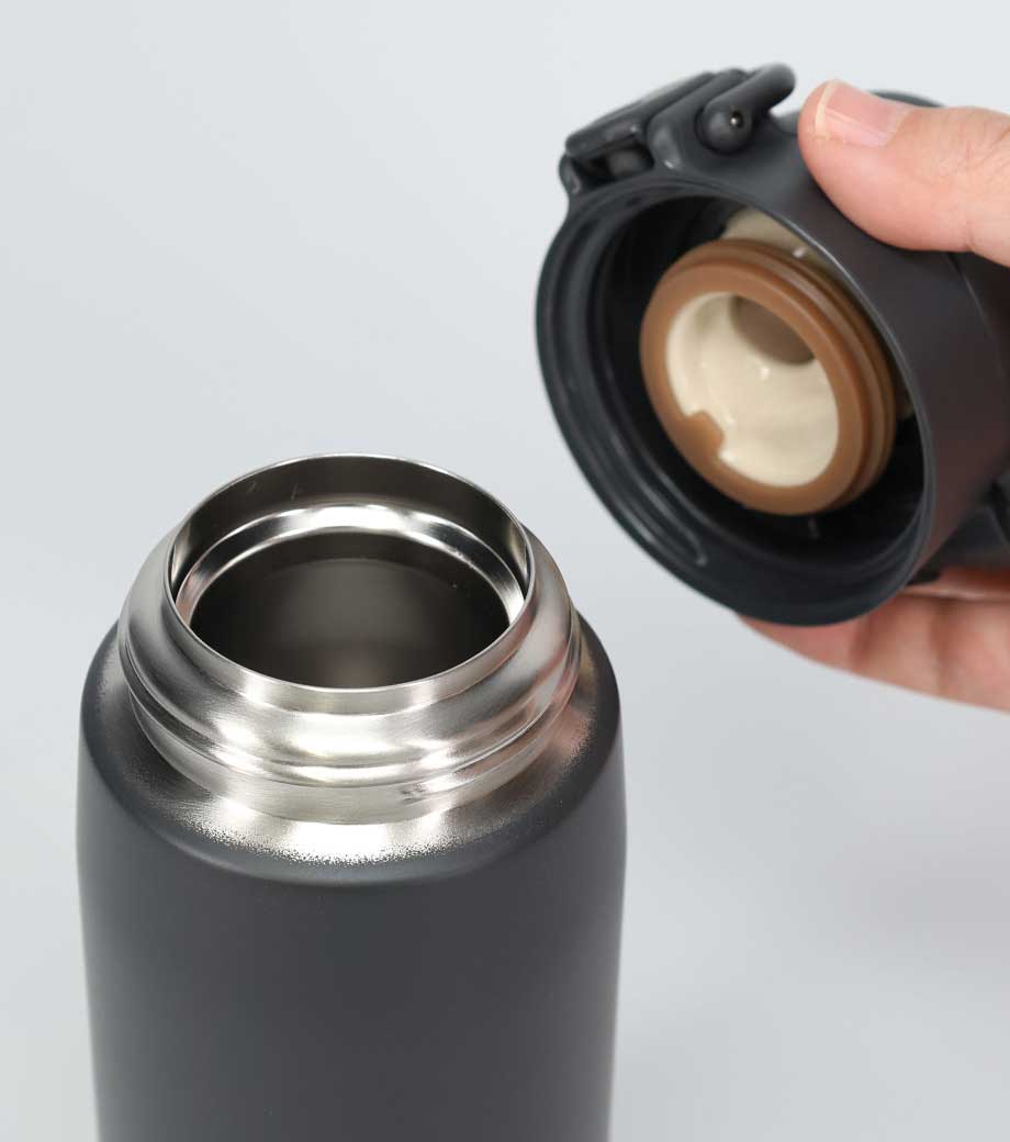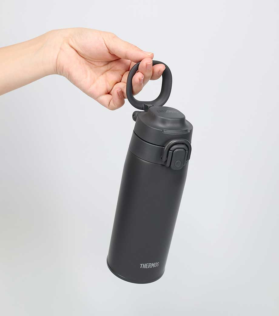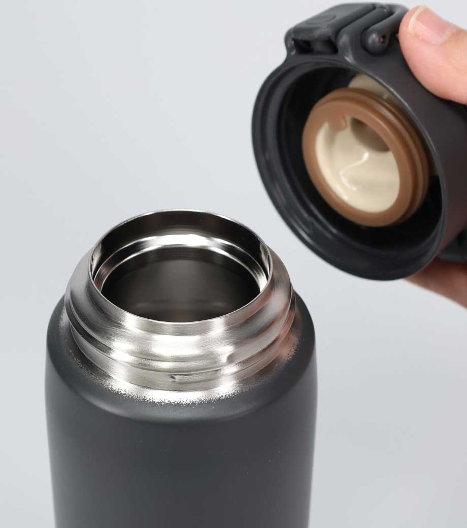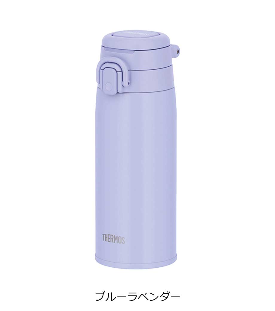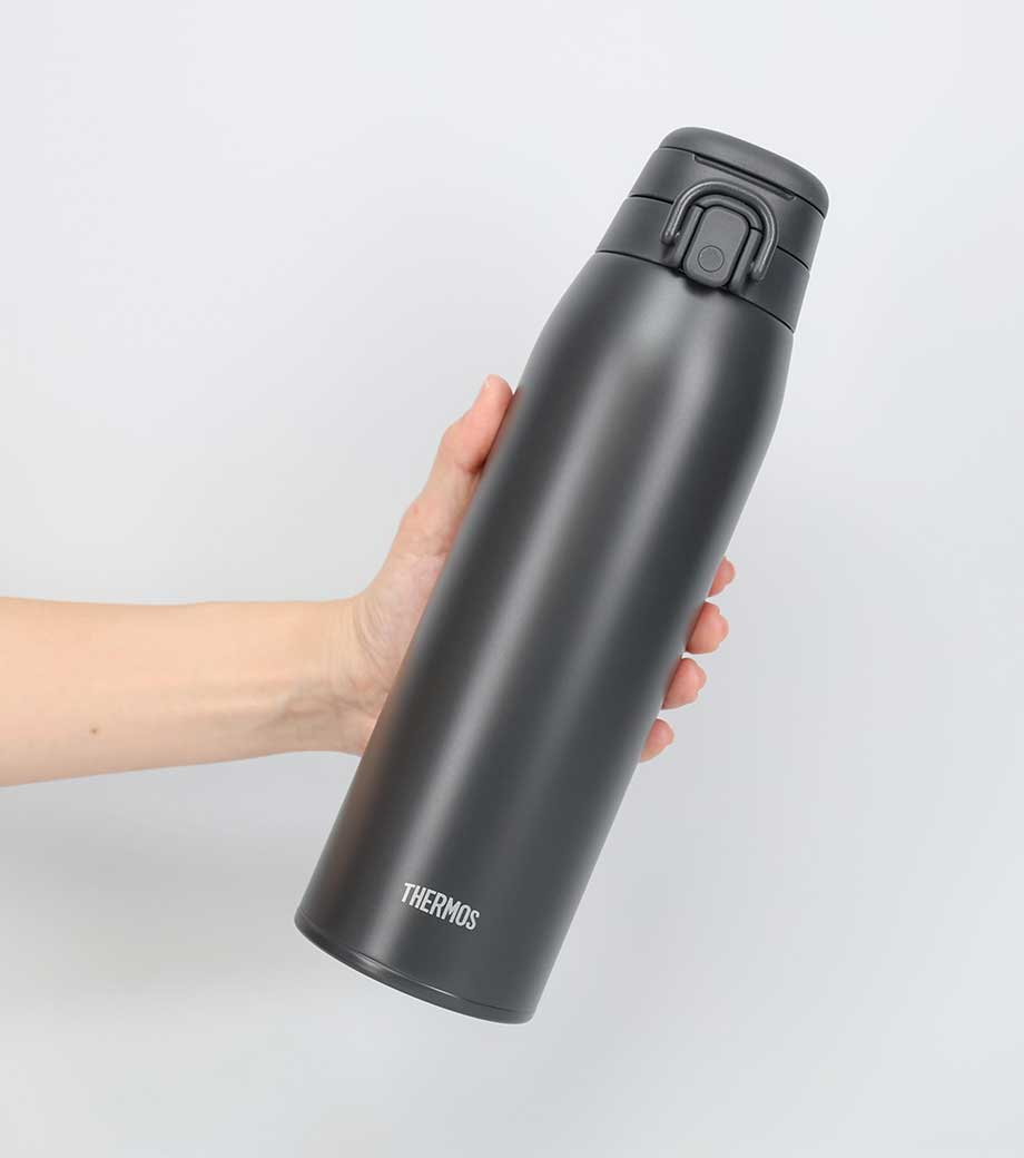 ワンプッシュで手軽に水分補給できる、真空構造の保冷温ステンレスボトルです。容量はペットボトル1本分の約500mlで、通勤・通学からスポーツシーンまで幅広く使えます。誤ってフタが開くのを防ぐスライドロック付きです。広口で氷を入れやすく、冷たい飲み物の温度も長時間キープ。底面にはすべり止めが付いており、デスクでも安定して置けます。