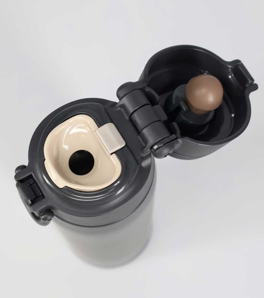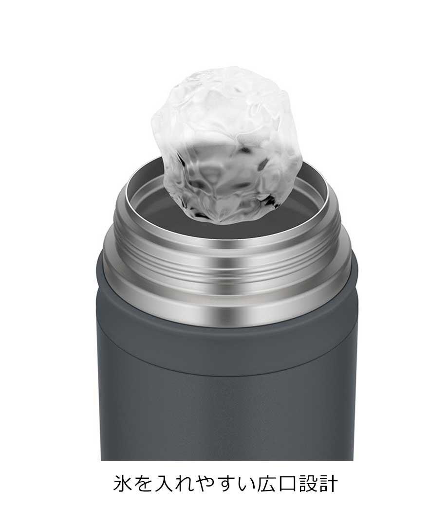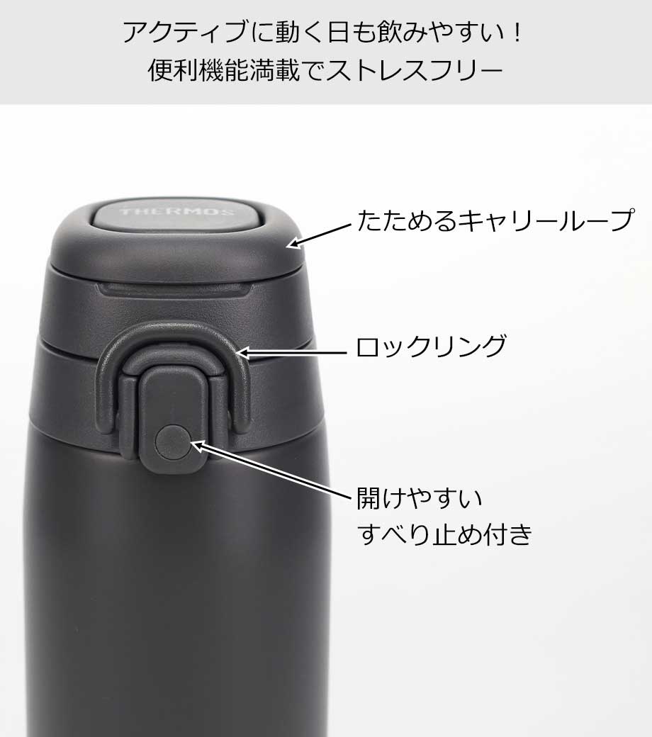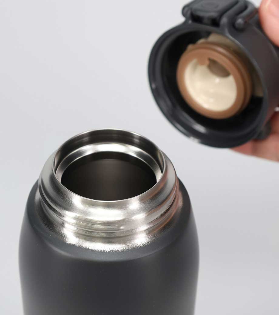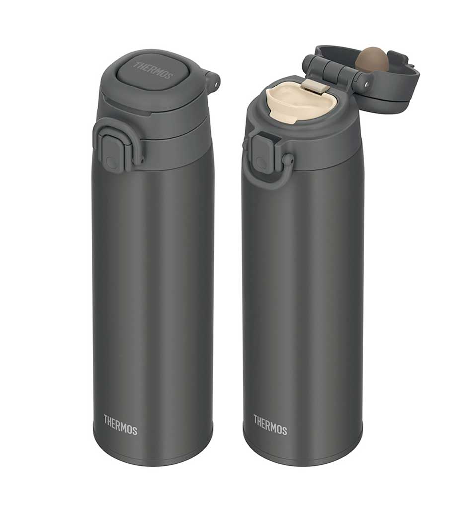 ワンプッシュで手軽に水分補給できる、真空構造の保冷温ステンレスボトルです。容量はペットボトル1本分の約500mlで、通勤・通学からスポーツシーンまで幅広く使えます。誤ってフタが開くのを防ぐスライドロック付きです。広口で氷を入れやすく、冷たい飲み物の温度も長時間キープ。底面にはすべり止めが付いており、デスクでも安定して置けます。