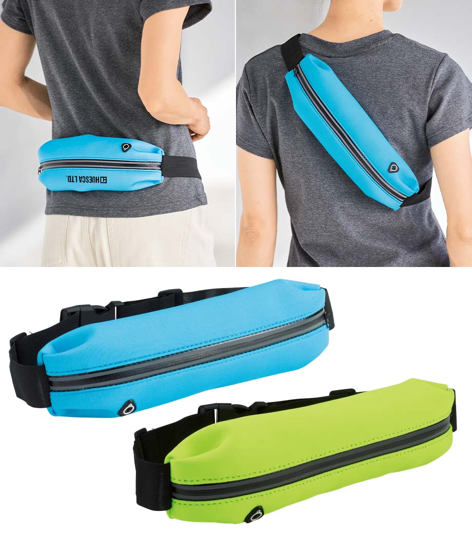 ウエストポーチとショルダーポーチの2wayで使えるポーチです。ポーチは伸縮性のあるEVA素材&伸縮ベルトで身体にフィットします。500~600mlのペットボトルが収納できてウォーキングやジョギング、サイクリングでの使用にぴったりです。イヤフォンコードを通せるコードホール付き。ファスナ外側には反射テープが付いているから夜道も安心です。