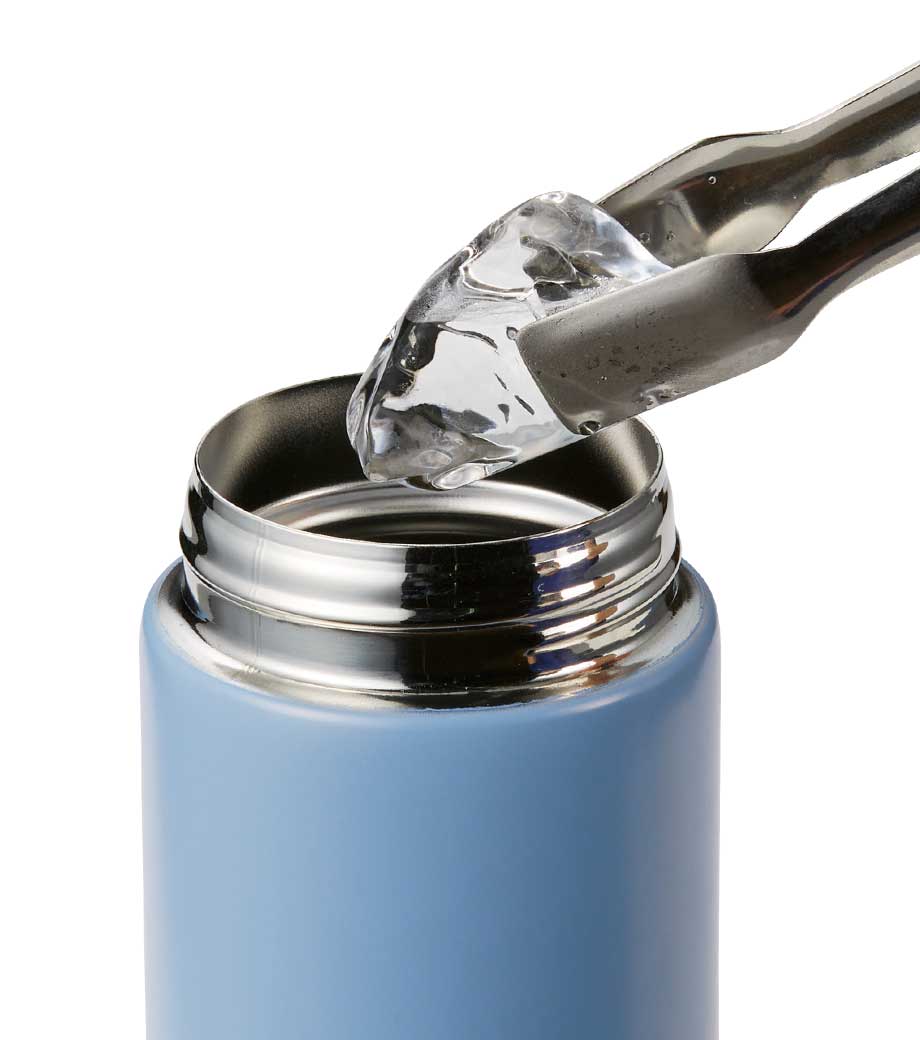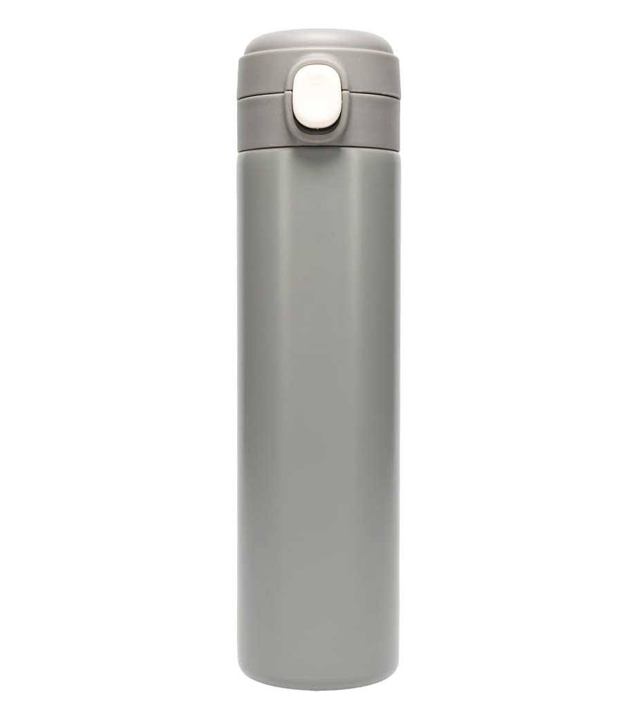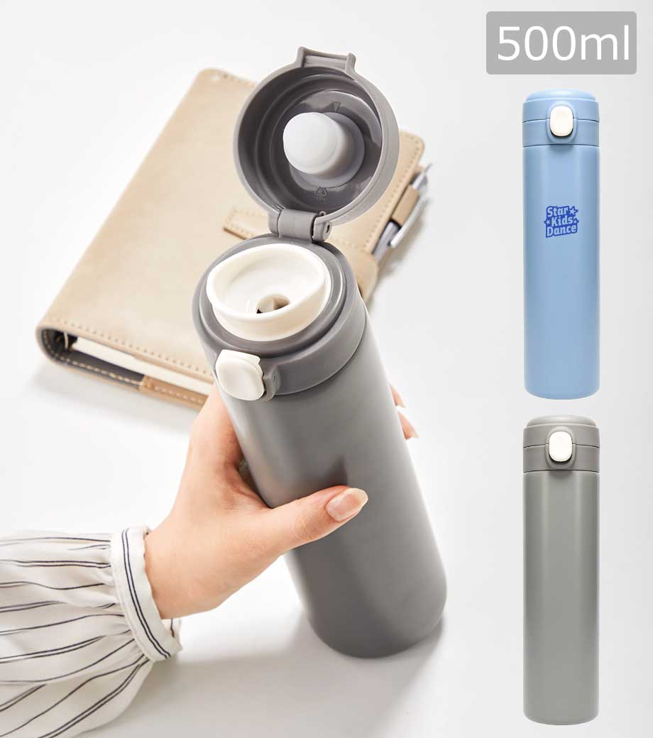ワンプッシュで手軽に水分補給できる、真空構造の保冷温ステンレスボトルです。容量はペットボトル1本分の約500mlで、通勤・通学からスポーツシーンまで幅広く使えます。誤ってフタが開くのを防ぐスライドロック付きです。広口で氷を入れやすく、冷たい飲み物の温度も長時間キープ。底面にはすべり止めが付いており、デスクでも安定して置けます。