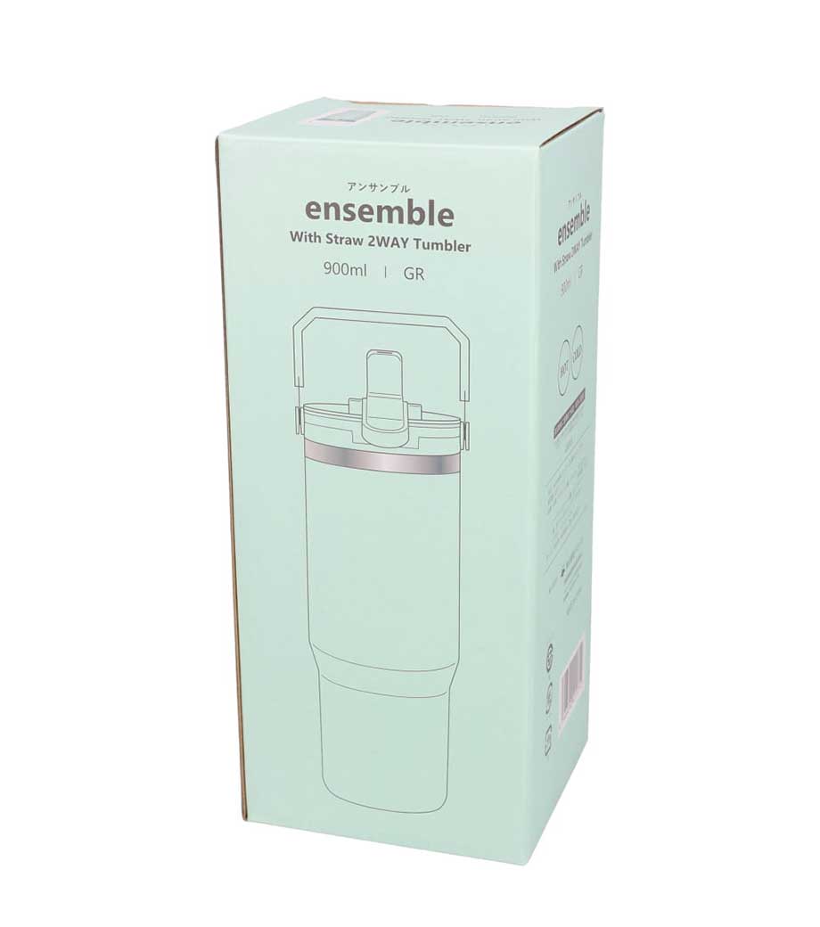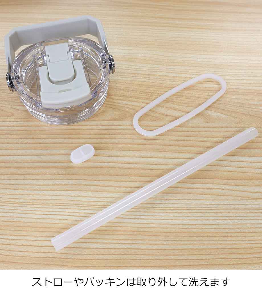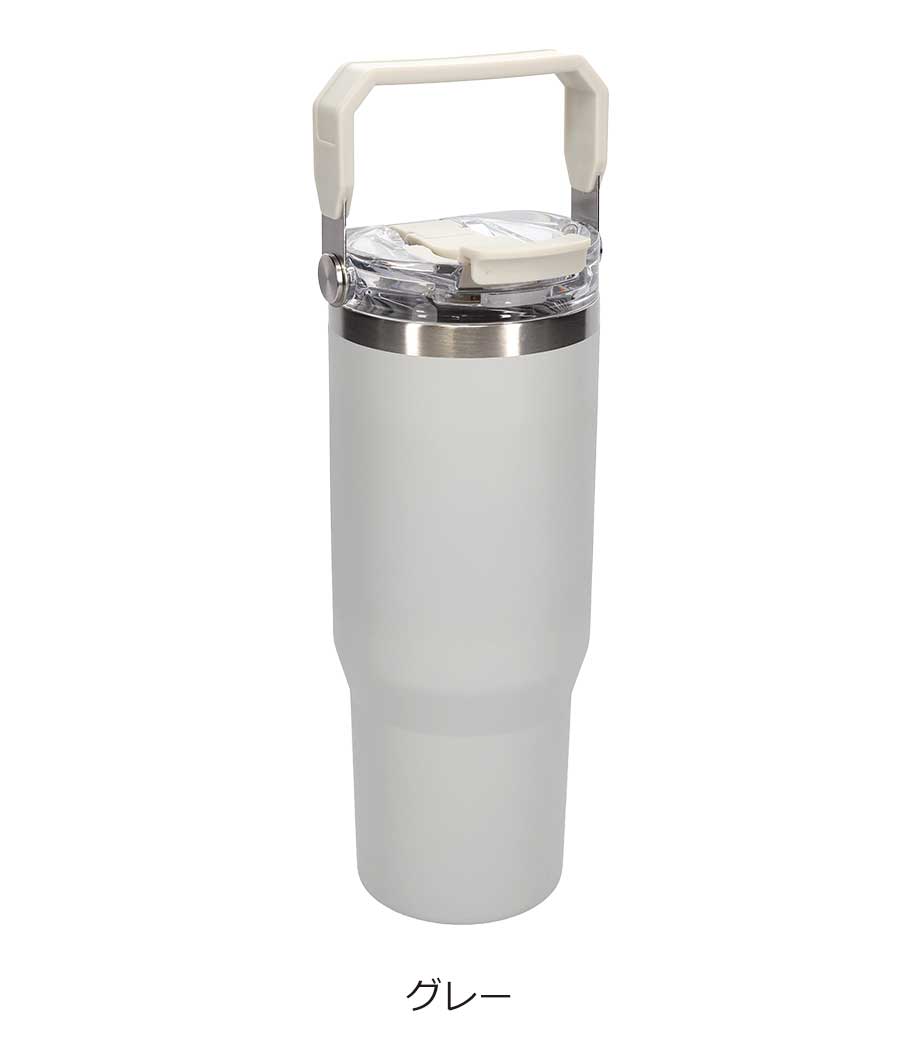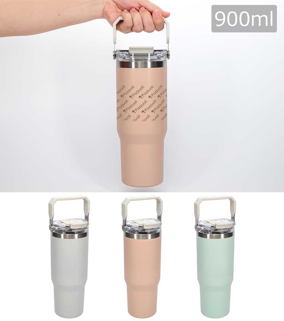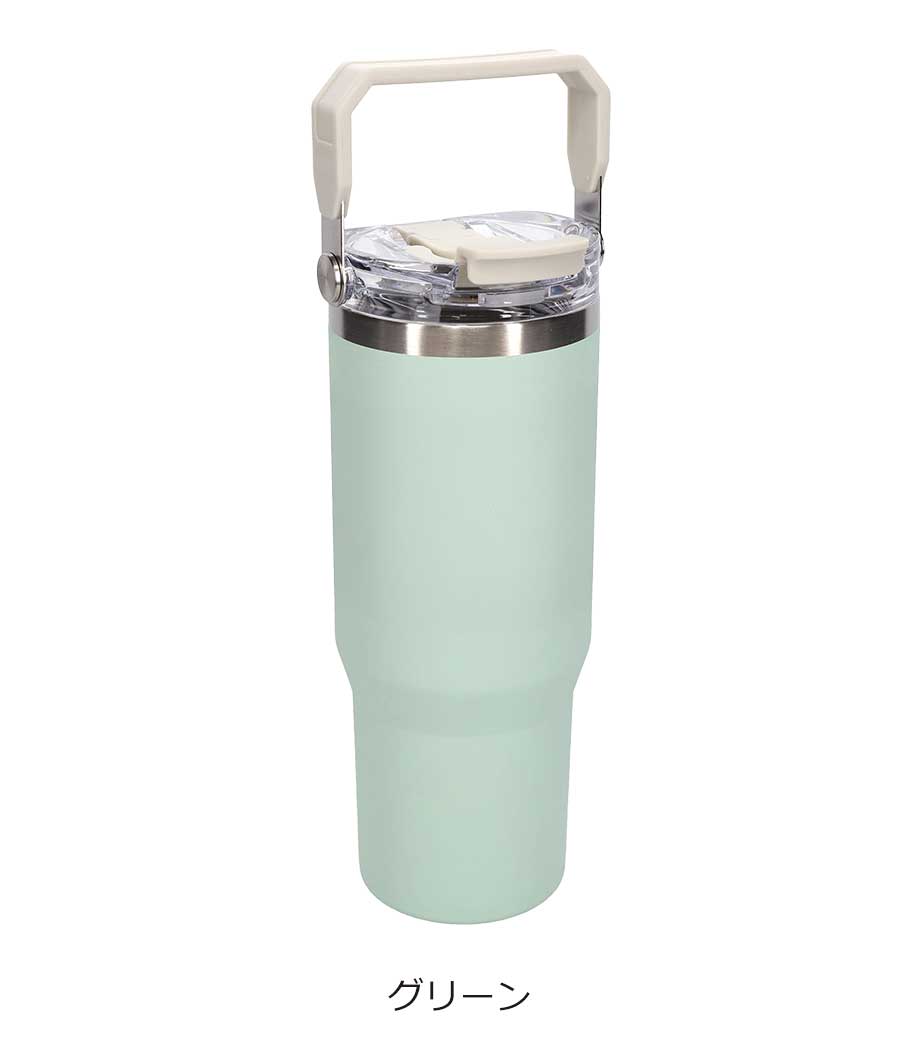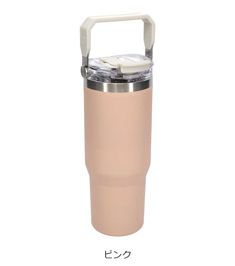 ストローと直飲みの2WAY仕様が便利なタンブラー。900ml容量のビッグサイズです。真空二重構造で保温・保冷の両方に対応し、アイスドリンクには専用ストローが活躍。ハンドル付きで持ち運びやすく、口径が広いため大きな氷が入るのも嬉しいですね。底まで手が届きやすいので、お手入れも簡単です。下部はスリム設計で、直径約7.5cm以上のドリンクホルダーに対応。運転中の水分補給にもおすすめです。