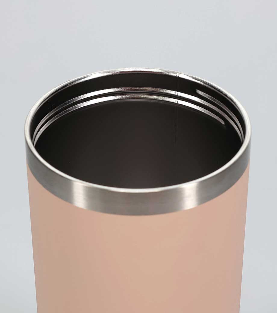 飲み頃温度を長時間キープできる真空二重構造です。広口でコップのような心地よい飲みやすさが魅力。蓋は持ち運びに便利なハンドル付きで、密閉しやすいスクリュー形状です。表面は少しザラっとしたマットな質感で、ニュアンスカラーがおしゃれ。