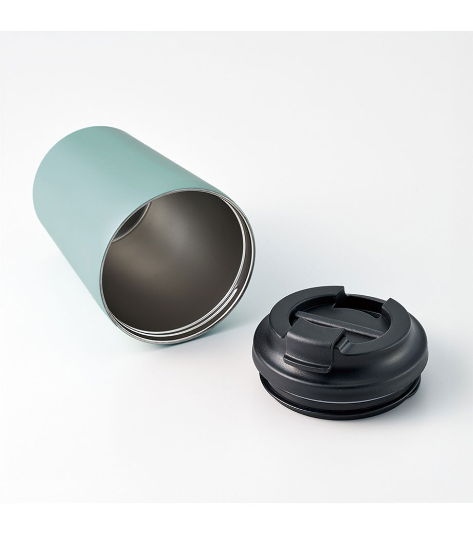 飲み頃温度を長時間キープできる真空二重構造です。広口でコップのような心地よい飲みやすさが魅力。蓋は持ち運びに便利なハンドル付きで、密閉しやすいスクリュー形状です。表面は少しザラっとしたマットな質感で、ニュアンスカラーがおしゃれ。