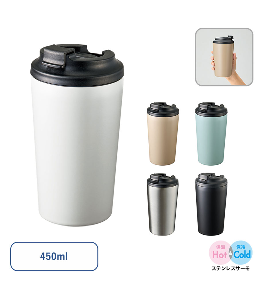 ステンレス・コンビニタンブラーは、容量約450mlでデスクワークのお供にピッタリなサイズ感。コンビニなどで購入した飲み物のカップを入れれば、ドリンクホルダーとしても使えます。