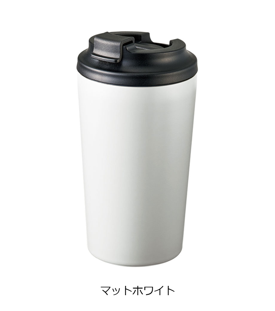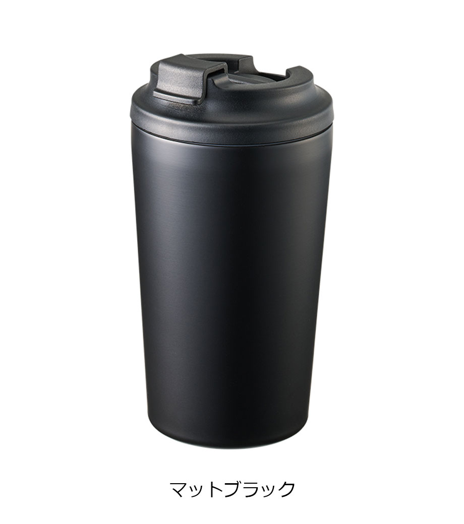 シンプルなモノトーンカラーに、ステンレスのワンポイントがスタイリッシュなタンブラーです。熱いものは冷めにくく、冷たいものは結露しにくい二重構造になっています。開け閉めラクラクなフラップ付きのフタが使いやすいポイント。ホコリなどが入りにくく、飲み口からはこぼれにくいです。フラップは後ろに倒して固定もできます。